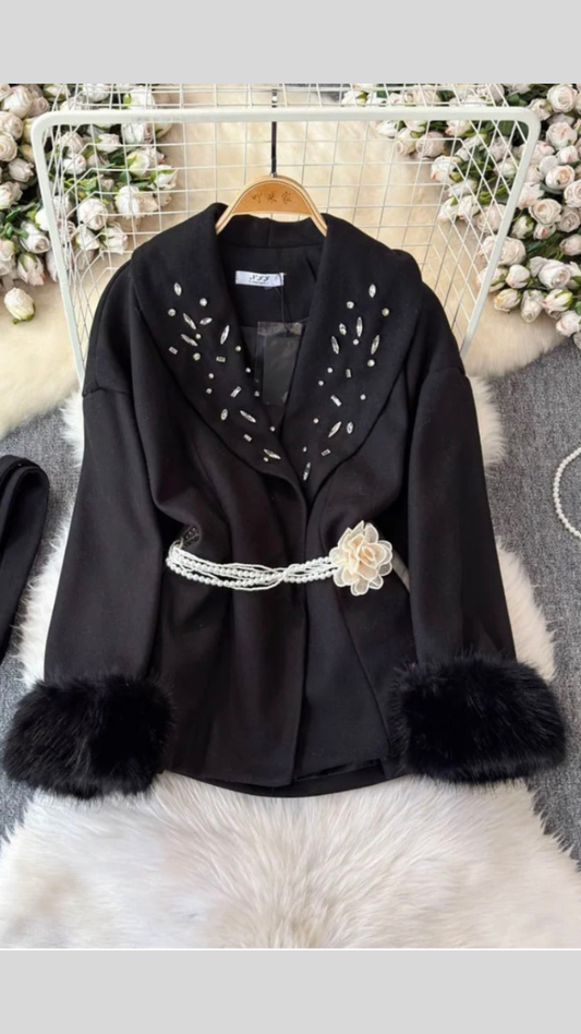 Crystal Designed Collar Furr Sleeve With Pearl Belt Blazer FC1952