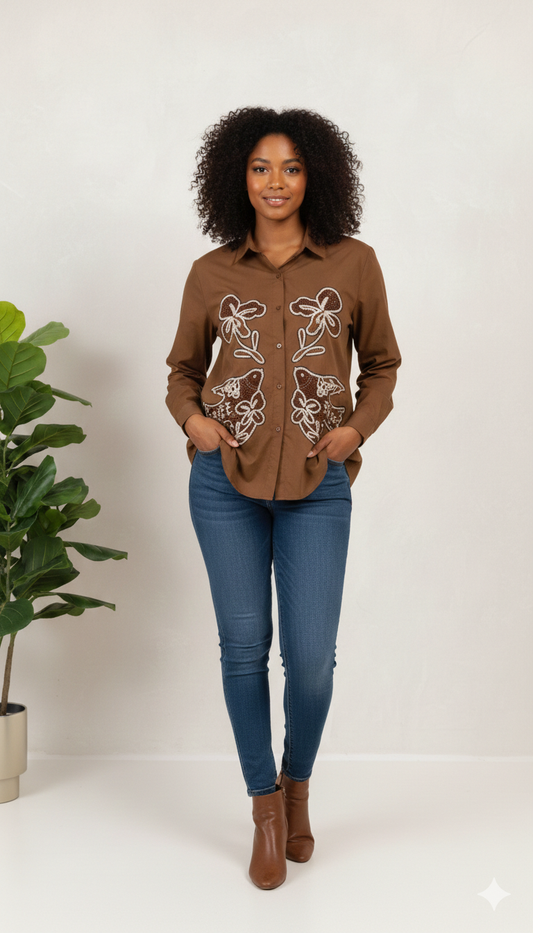 Floral Embroidery Designed Front And Sleeve Cotton Shirt FC2149