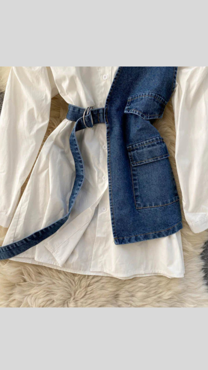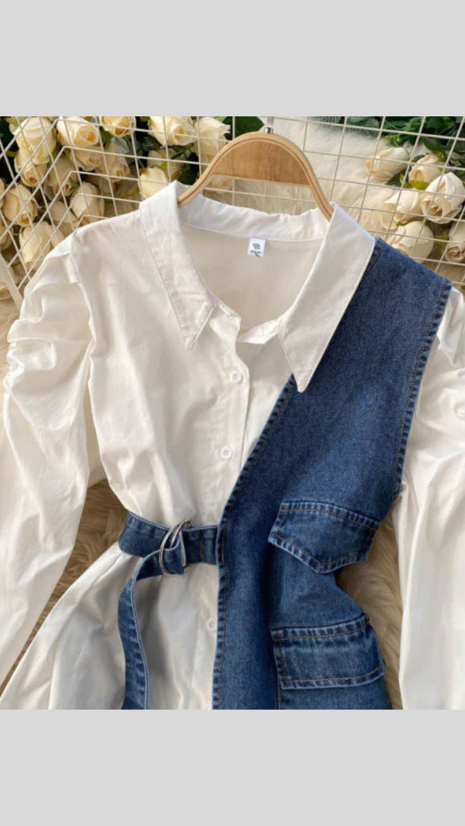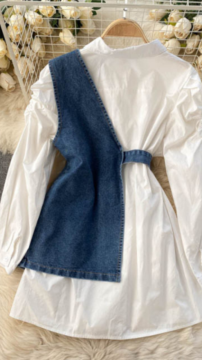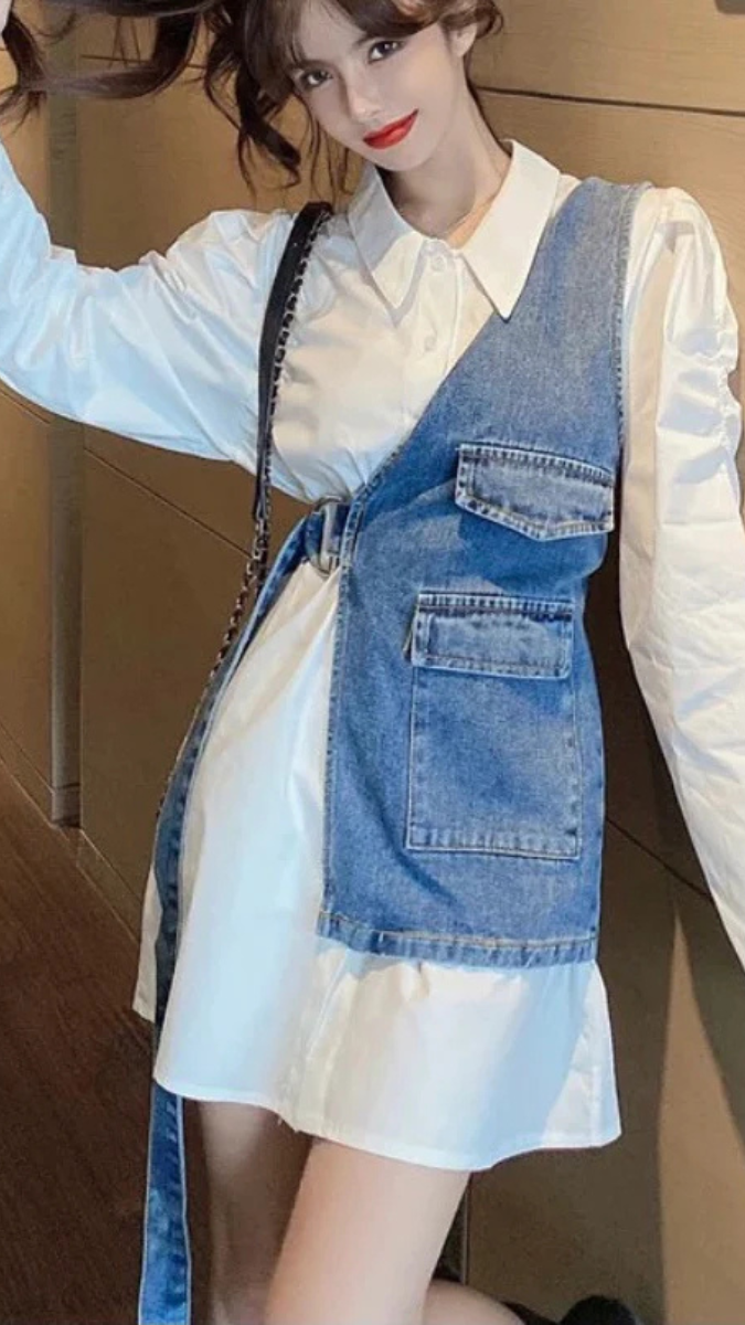 2-Piece Shirt Dress With Half Denim Vest FC1791