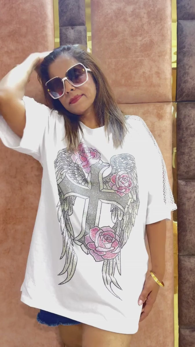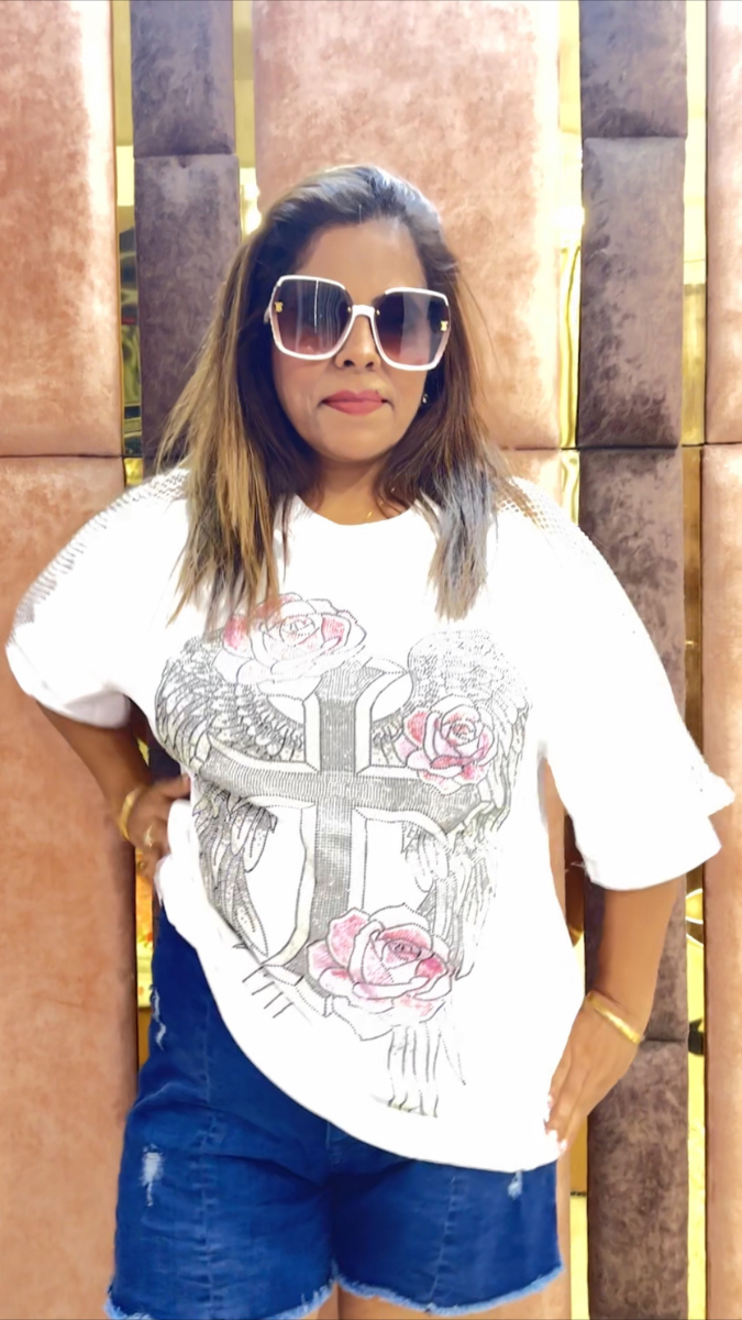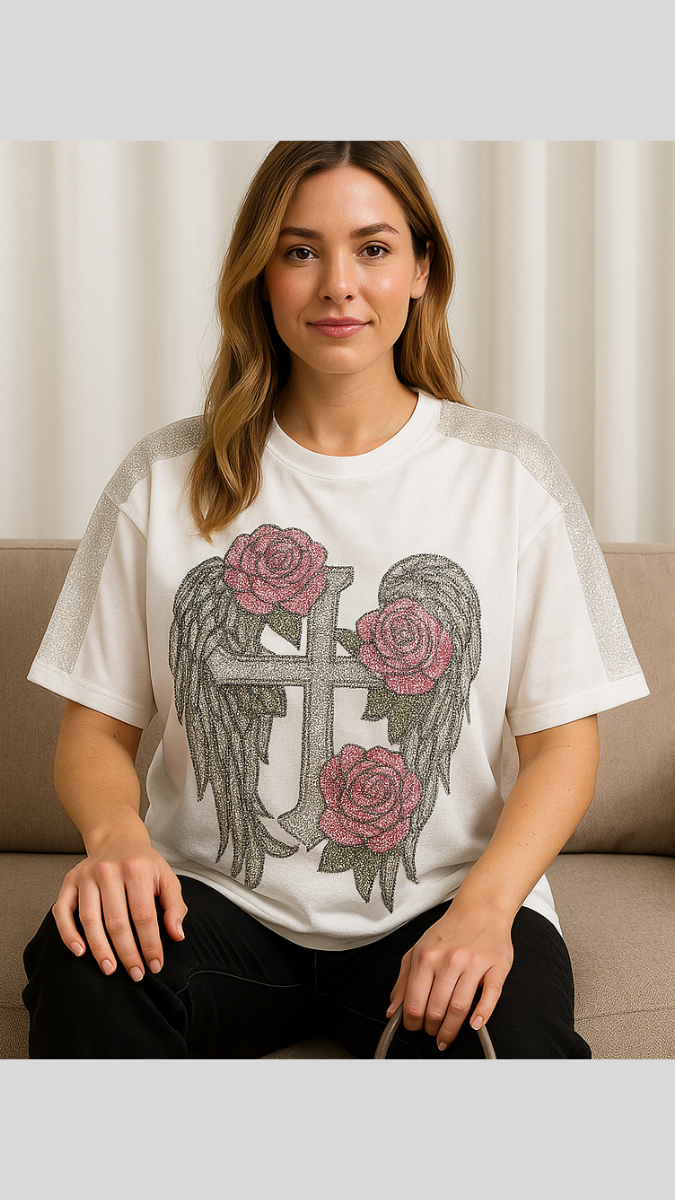 Angel T-Shirt has short sleeves, round neck, drop shoulder, loose, printed rose design on front, Simple but stylish, a must have plus size women's tops in your wardrobe. Perfect for daily wear, casual wear, vacation, weekend, holidays, club, party, festival, beach, outgoing, etc.