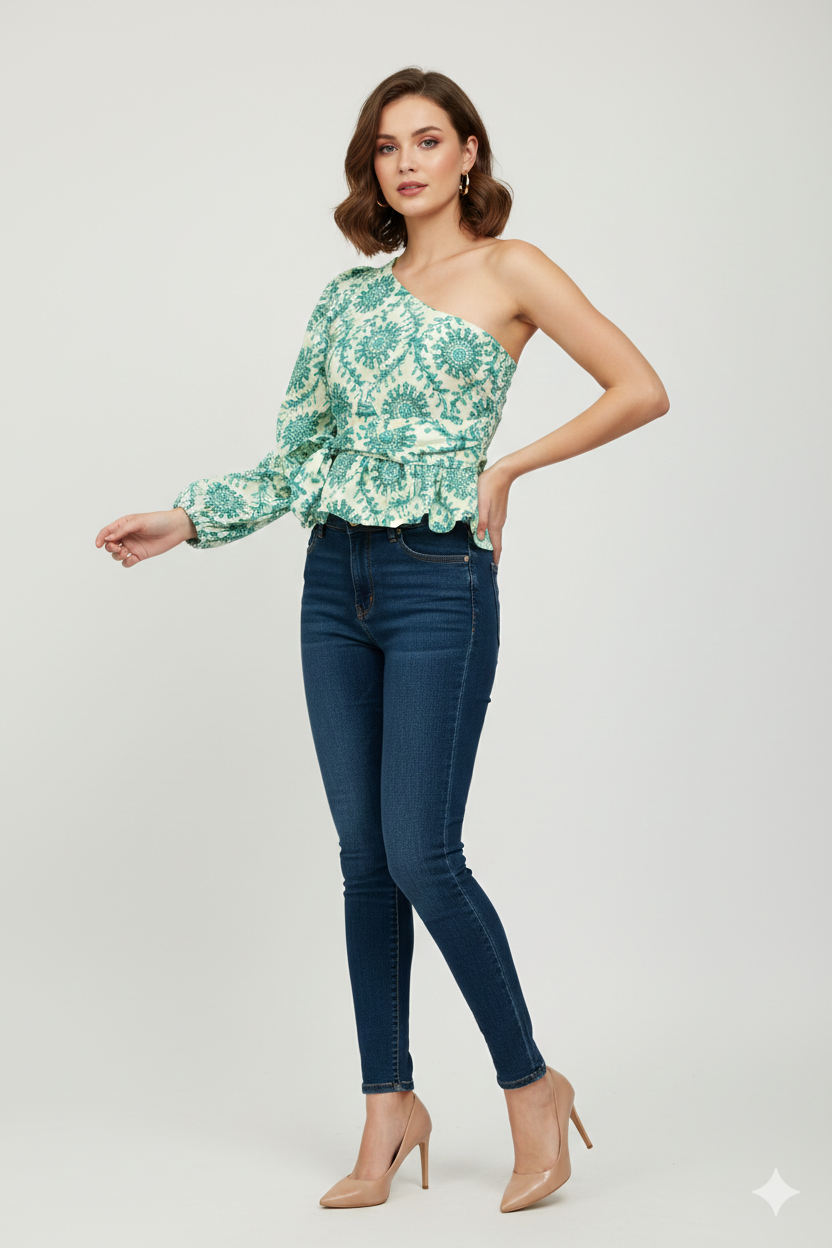 Beautiful One Shoulder Top adorned with Printed all over. This top has one shoulder full sleeves, printed, pleated on waist, belt, very erotic and fashionable. Perfect for casual, carnival, party, rave costume, outfits, clothes gifts, wedding and cocktail.