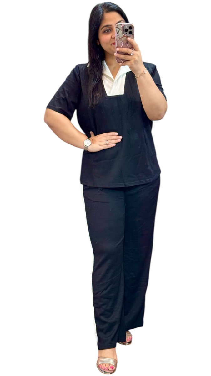 This Broad White Collar Top and Trouser set offers a crisp, professional look ideal for formal or business settings. The top features a broad white collar that adds a refined touch, complementing the tailored trousers for a polished silhouette. Crafted for comfort and style, this ensemble ensures you maintain a sharp appearance throughout your day. Perfect for workwear or sophisticated casual occasions, it balances classic design with modern detailing.