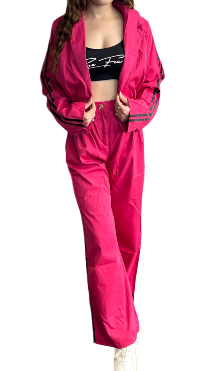 Our Designer Crop Jacket Style Co- Ord Set is summer-friendly color featuring pants with shirt is for sure a show-stopper. Shirt has jacket style, collar neck, crop length with elastic, full sleeves with stripes on it and pants has ankle length, button closure on waist, stripe design on sides . Co- Ord is suitable from a day occasion, tonight's get-together.
