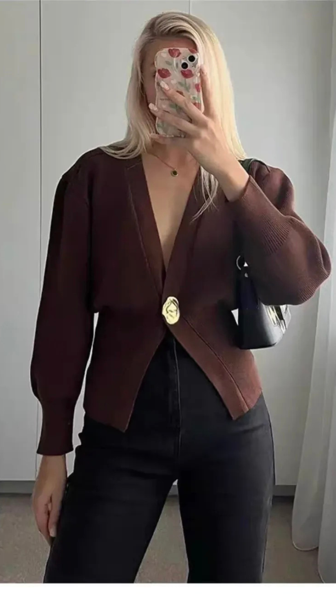 Elevate your winter wardrobe with this sophisticated woolen top, featuring a striking deep V neckline that flatters and elongates. The single button closure adds refined detail and versatile styling options—wear it buttoned for polished elegance or open as a layering piece. Crafted from quality wool, this top provides exceptional warmth while maintaining a lightweight, breathable feel. The timeless silhouette transitions seamlessly from office settings to casual gatherings, making it an essential investment piece for any season. Perfect for pairing with tailored trousers, jeans, or skirts.