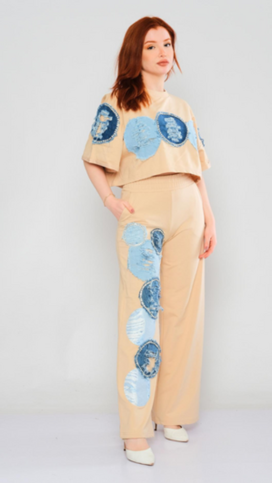 Denim Patchwork With Rhinestone Co- Ord Set FC1052