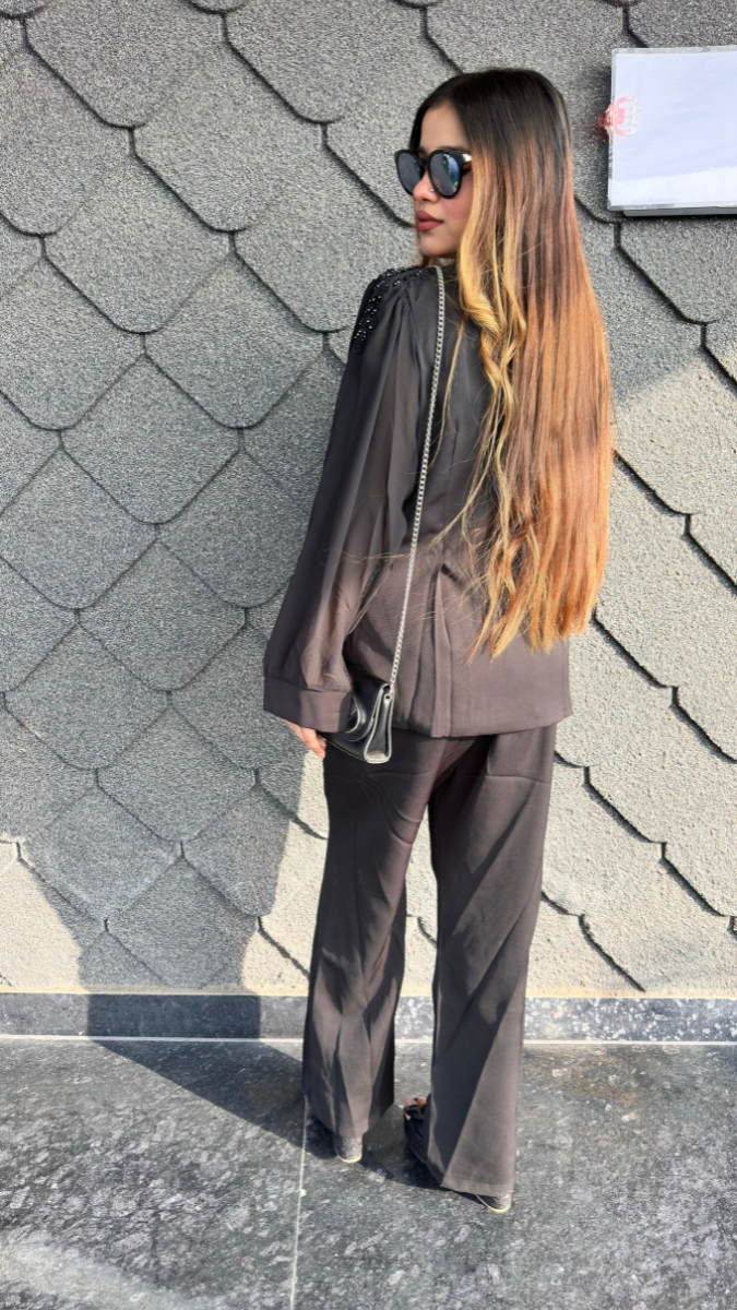 Elevate your wardrobe with this sophisticated designer coordinate set featuring a striking shoulder-detail top paired with tailored pants. The architectural shoulder design creates a commanding silhouette, while premium fabric ensures comfort and durability throughout the day. Perfect for professional settings, upscale casual occasions, or making a refined statement at social events. The coordinated styling eliminates guesswork, allowing you to look polished effortlessly. Versatile enough to transition from office to evening with minimal accessorizing, this set represents contemporary fashion craftsmanship at its finest.