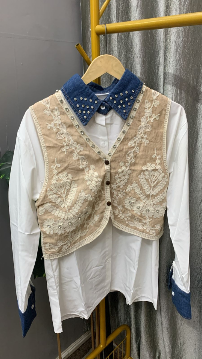 Elegant and timeless, this embroidery designed vest with plain shirt set combines classic style with beautiful detailing. The plain shirt offers a clean and versatile base, while the embroidered vest adds texture, artistry, and a refined touch to the outfit. Perfect for layering, this stylish combination creates a sophisticated yet effortless look. Pair it with jeans, trousers, or skirts for casual outings, workdays, or smart-casual occasions.