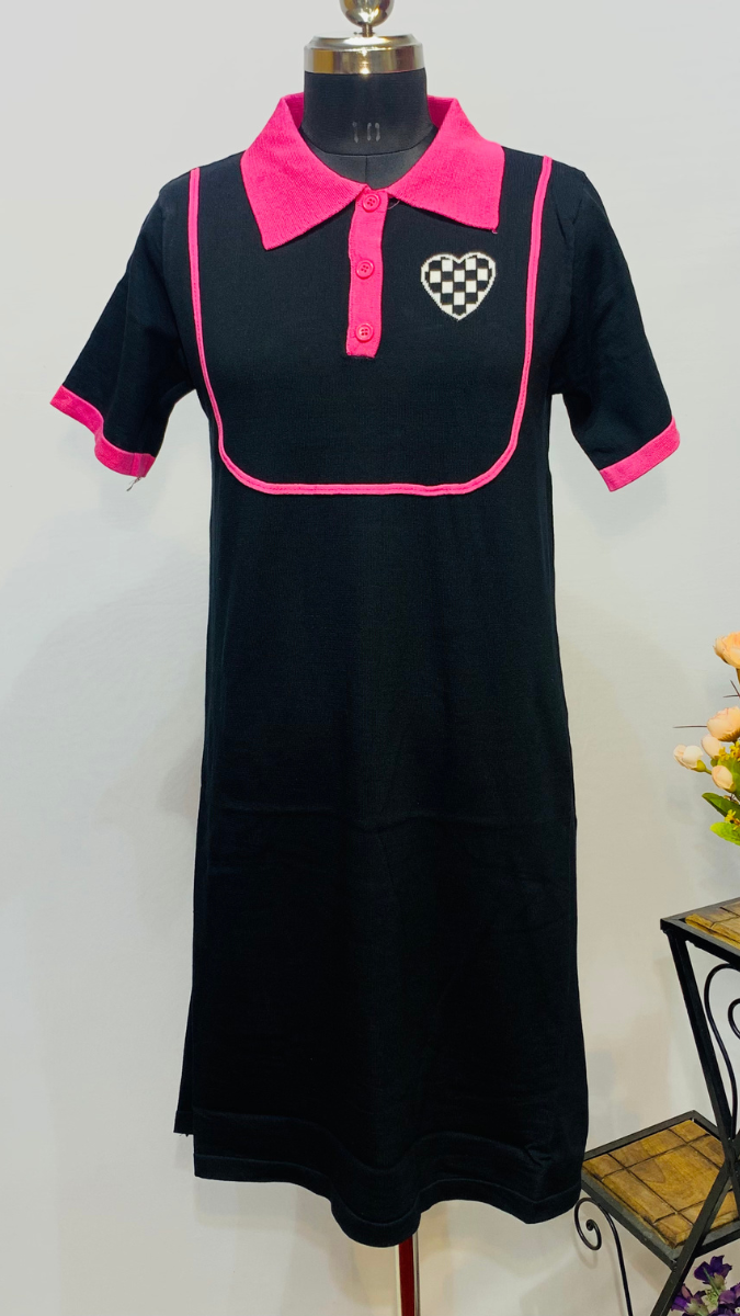 This dress has contrasting color collar, button placket, printed heart on the chest and short sleeves with ribbed trims. this dress is suitable for party, evening, homecoming, dinner.