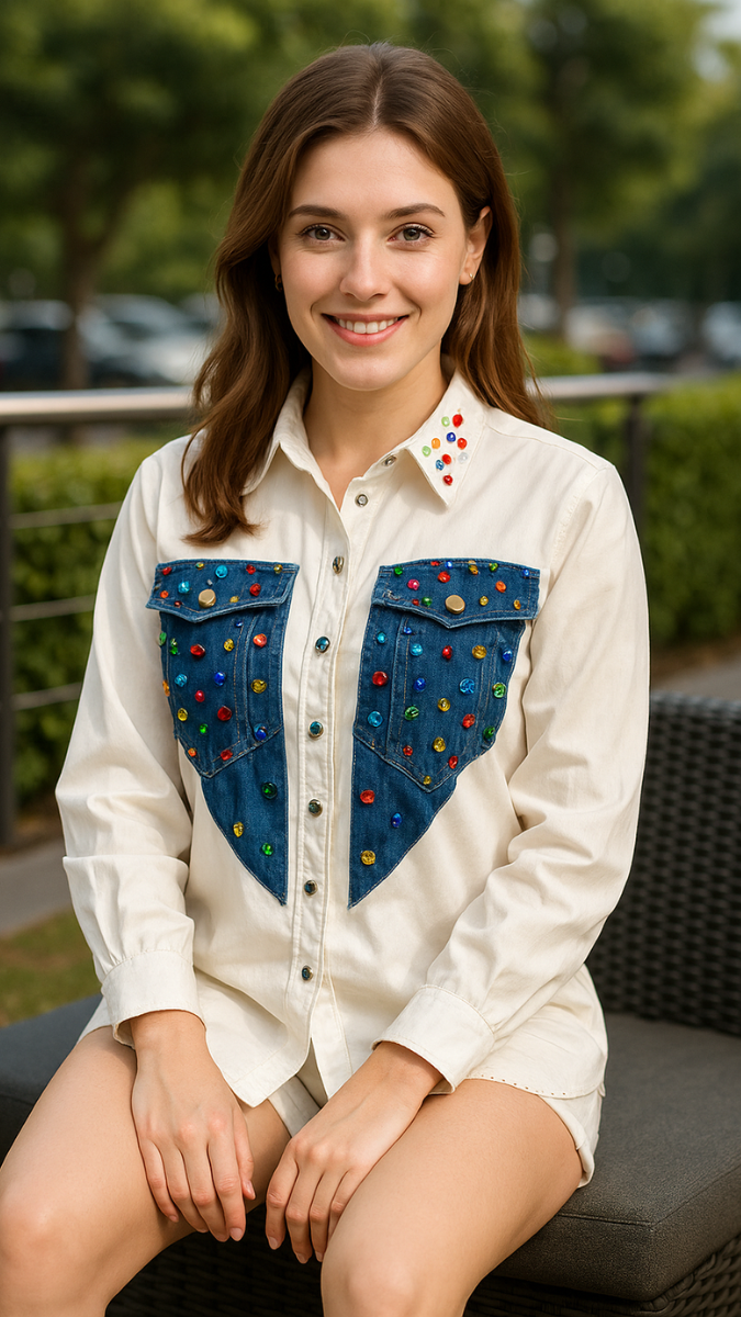 Get ready to bring the fabulous rhinestone western vibes with you everywhere you go with this sparkly shirt. This shirt features a heart-shaped button fastening, denim inserts with colorful crystals, long sleeves and collar enriched with crystal. length 29"| Bust42"| Sleeves 23".