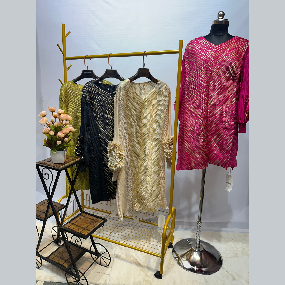 This dress has pleated front and ruffle sleeves. Stand out from the crowd with this fashionable piece that is perfect for any occasion. The flattering cut and subtle color palette make it a perfect addition to your wardrobe.
