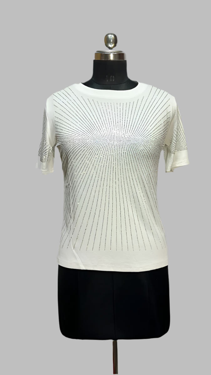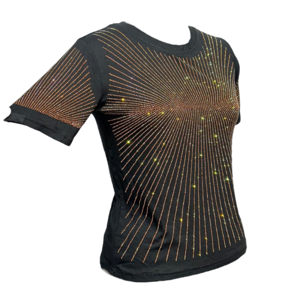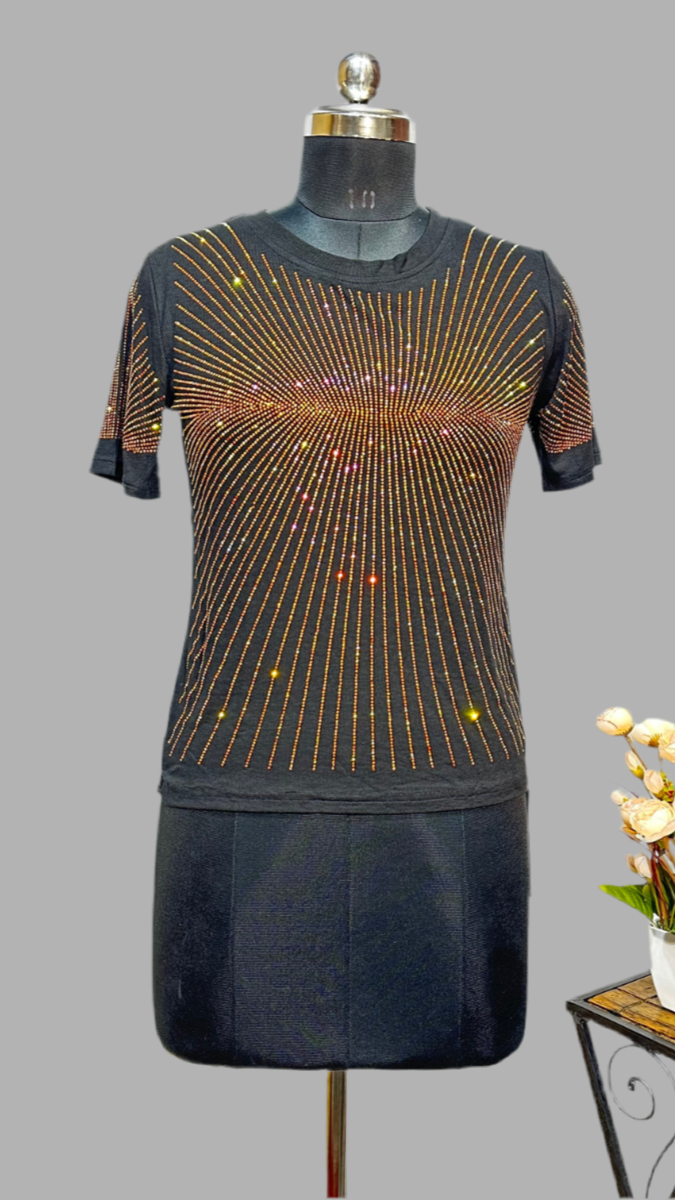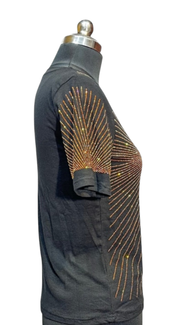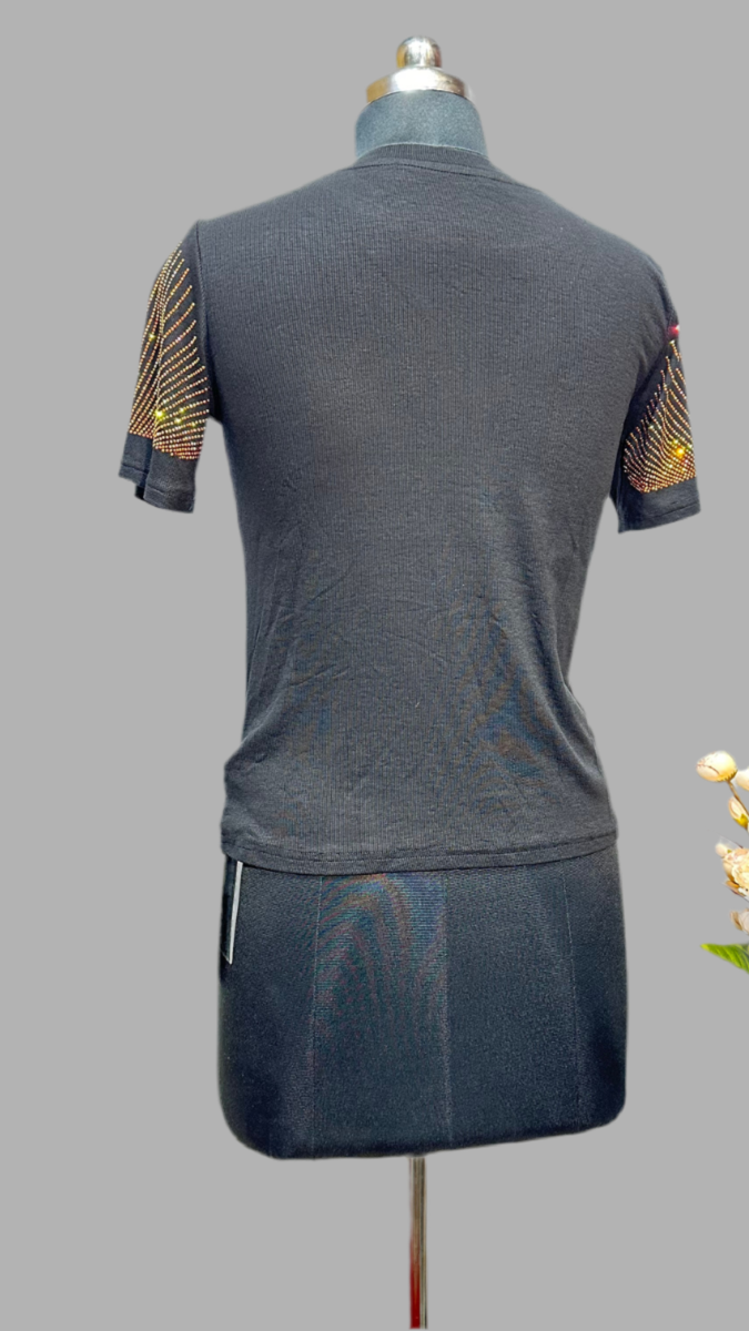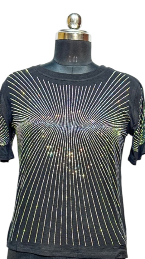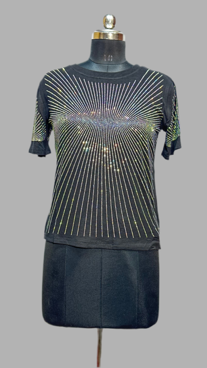 The top's flexible material ensures a comfortable fit, while the stunning rhinestone embellishments add a touch of elegance and glamour. Ideal for any party or event. Sleeves 9"| Length 24"