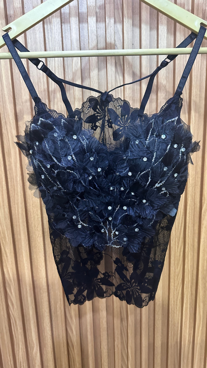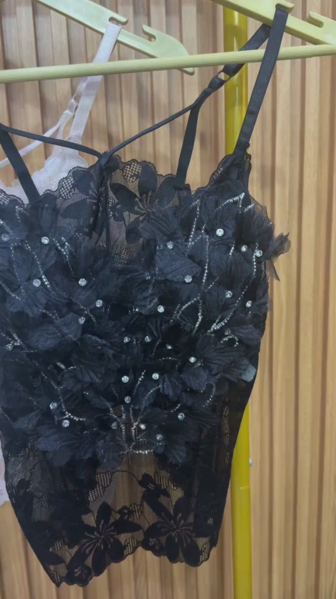 This Flower Lace Designed V Neck Crop Top features delicate floral lace detailing that enhances its sophisticated silhouette. The V-neck and slim straps offer a flattering fit, while the cropped length adds a modern edge. Ideal for pairing with high-waisted bottoms, this top combines elegance with contemporary style for a versatile wardrobe addition.