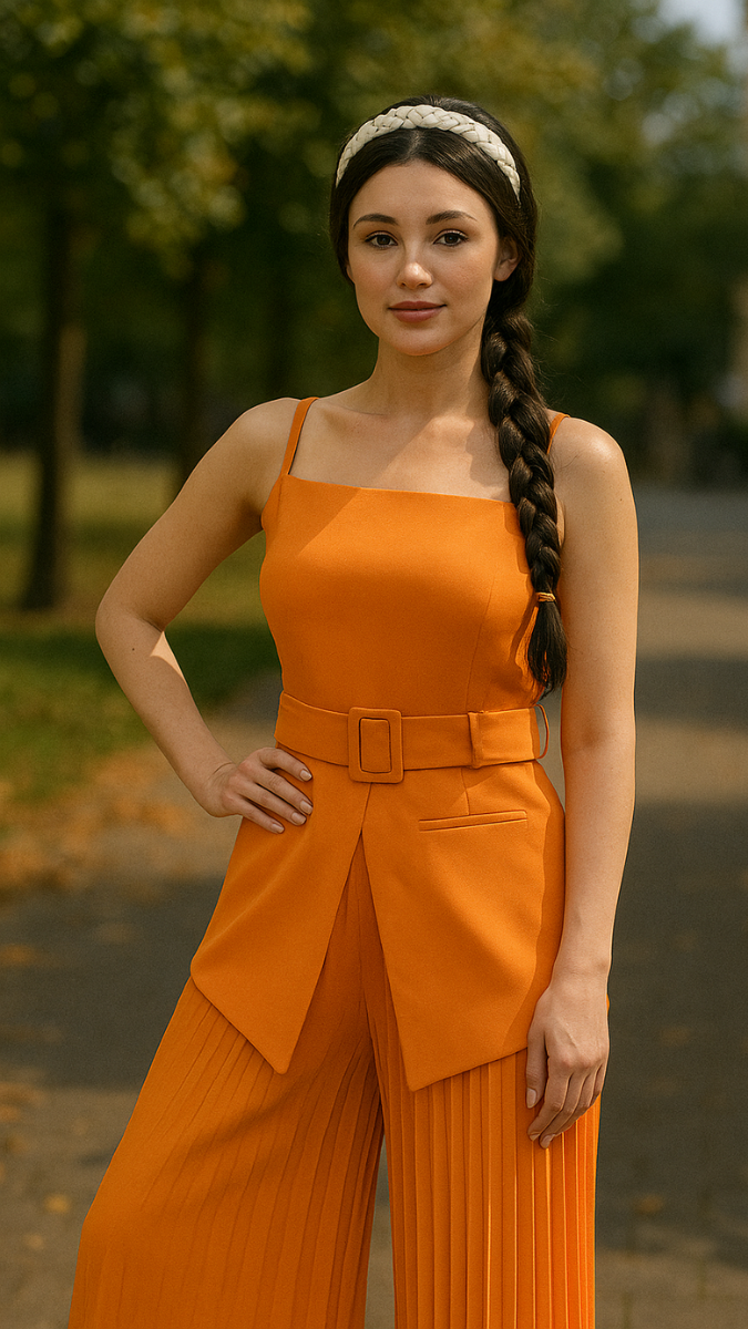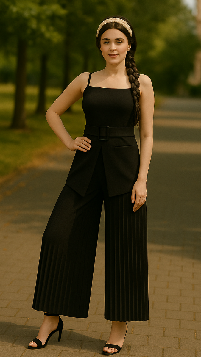 This coordinated set features a stylish front slit strap sleeve top paired with elegant ruffle pants, blending contemporary design with comfort. The top’s slit detail adds a modern edge, while the ruffle pants offer a flattering silhouette and graceful movement. Perfect for both casual outings and semi-formal occasions, this ensemble combines fashion-forward elements with ease of wear. Crafted to enhance your wardrobe with versatility and sophistication.