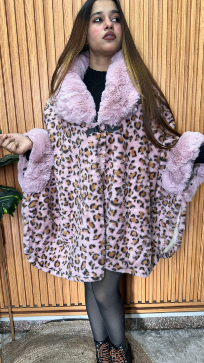 Elevate your winter wardrobe with this striking leopard print cape, featuring a luxurious fur collar that adds sophistication and warmth. The bold animal print makes an instant style statement, while the flowing silhouette offers effortless elegance for both casual and formal occasions. Perfect for layering over dresses or sweaters, this versatile piece transitions seamlessly from day to evening wear. The plush fur trim frames the face beautifully and provides practical insulation during cooler months. A timeless investment piece that combines fashion-forward design with functional comfort.
