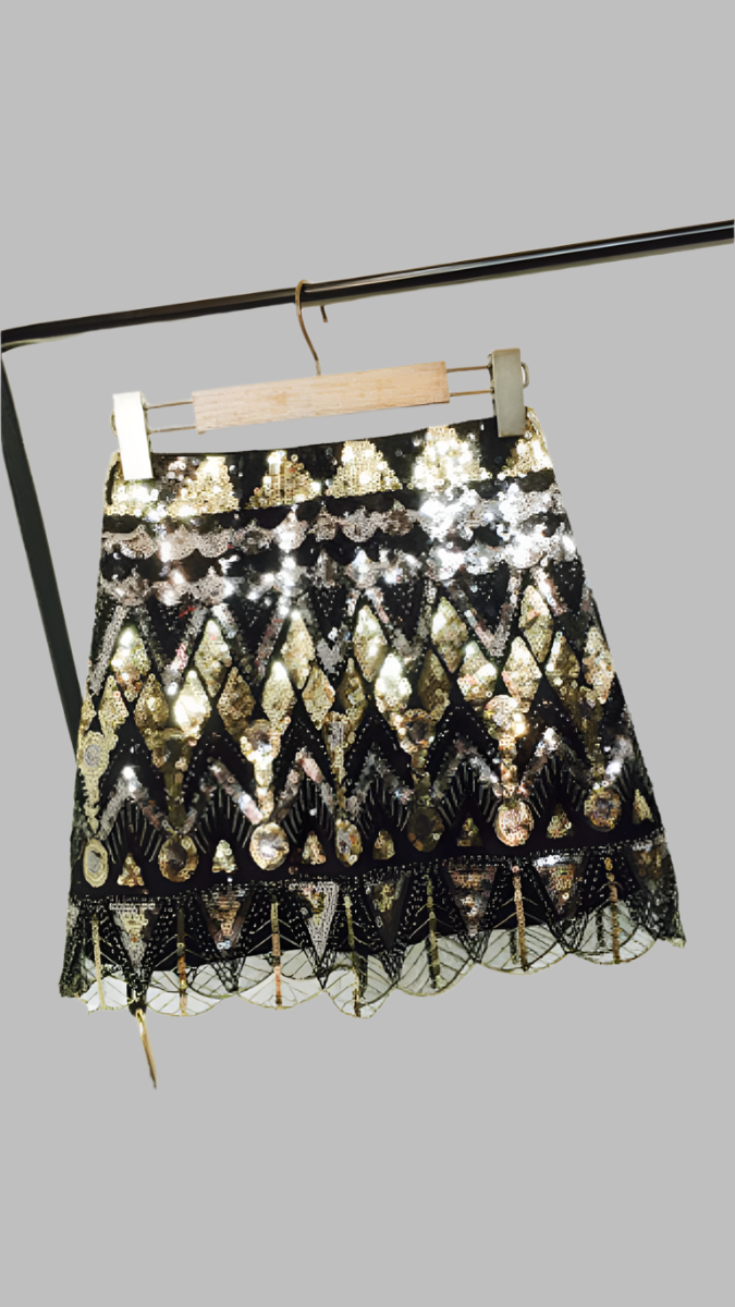 This Golden Sequence Mini Skirt features uneven even ends adorned with golden sequences, adding a touch of elegance to your outfit. Made with high-quality materials, it offers durability and comfort. Perfect for any special occasion or a night out, it's a must-have addition to your wardrobe.