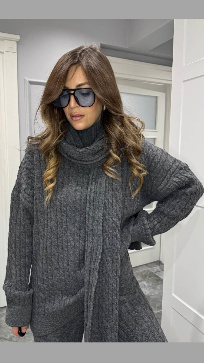 Master the art of coordinated styling with this refined three-piece ensemble. The high-neckline top showcases dramatic drop shoulders that create an on-trend silhouette, while the tailored pants provide a streamlined foundation. The included scarf serves as a styling accent, offering endless possibilities to customize your look. Designed for the discerning dresser, this set combines contemporary proportions with timeless appeal, making it an essential addition to any modern wardrobe. Ideal for layering, accessorizing, and creating multiple outfits from a single investment piece.