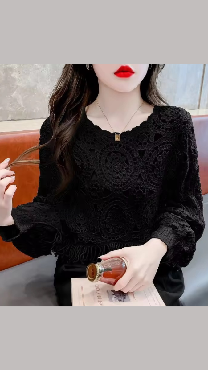 Hollow Out Crochet Loose Shirt Round Neck Top FC1834