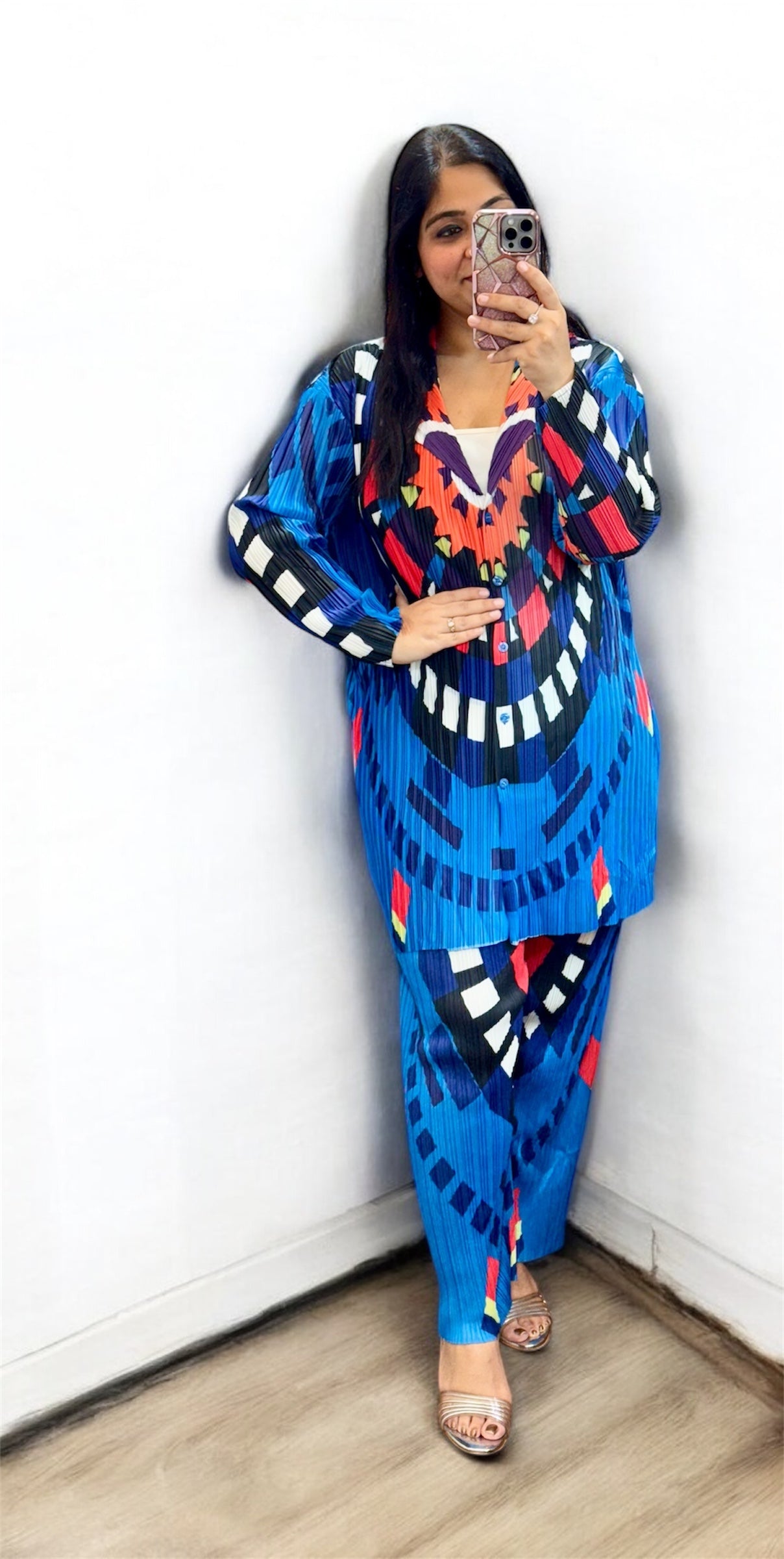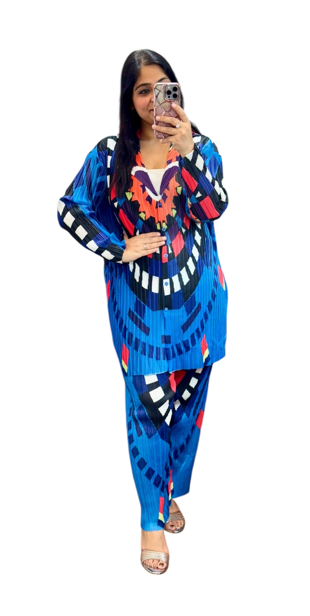 An easy way to add a stylish touch to any look, this set is ideal for making a statement. This co- ord set features top and pant, top features collar neck, full sleeves, beautiful designed all over and uneven ends. Pant has high waist, ankles length, elastic and flower designed all over. Suitable for summer vacations and weekend adventures.