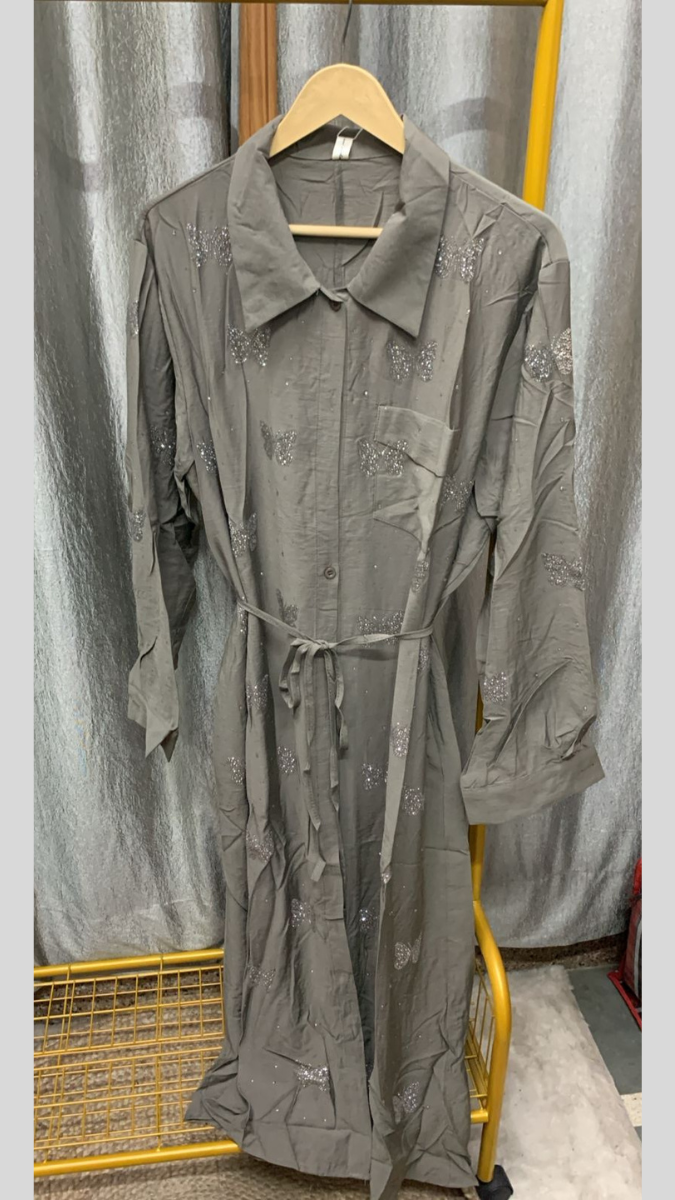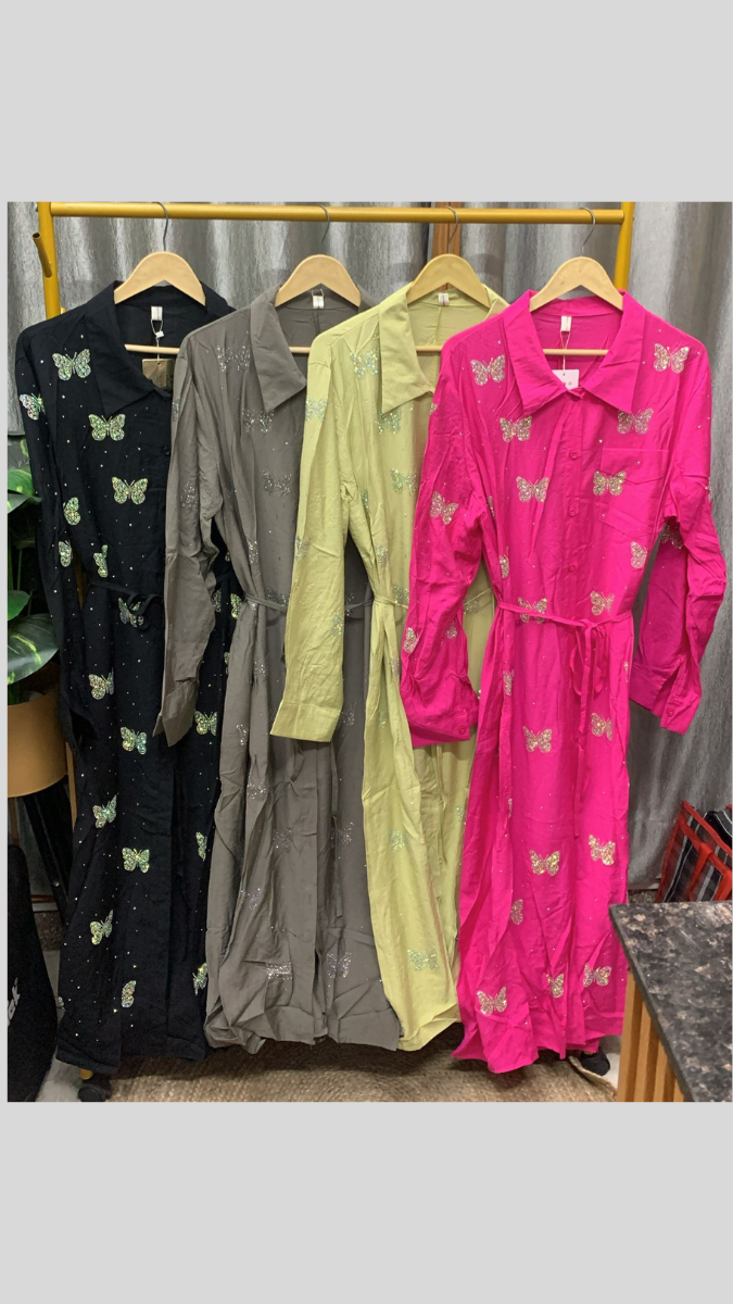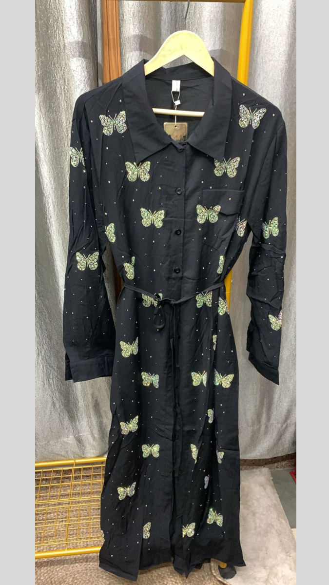 Elegant and eye-catching, this rhinestone butterfly embedded belted front buttoned A-line dress is designed to make a graceful statement. Delicate butterfly embellishments with sparkling rhinestones add a touch of charm and shimmer, while the front button closure brings classic style. The adjustable belt beautifully defines the waist, and the subtle front slit adds movement and modern flair. With its flattering A-line silhouette, this dress is perfect for special outings, brunch dates, or stylish day events where you want a blend of elegance and uniqueness.