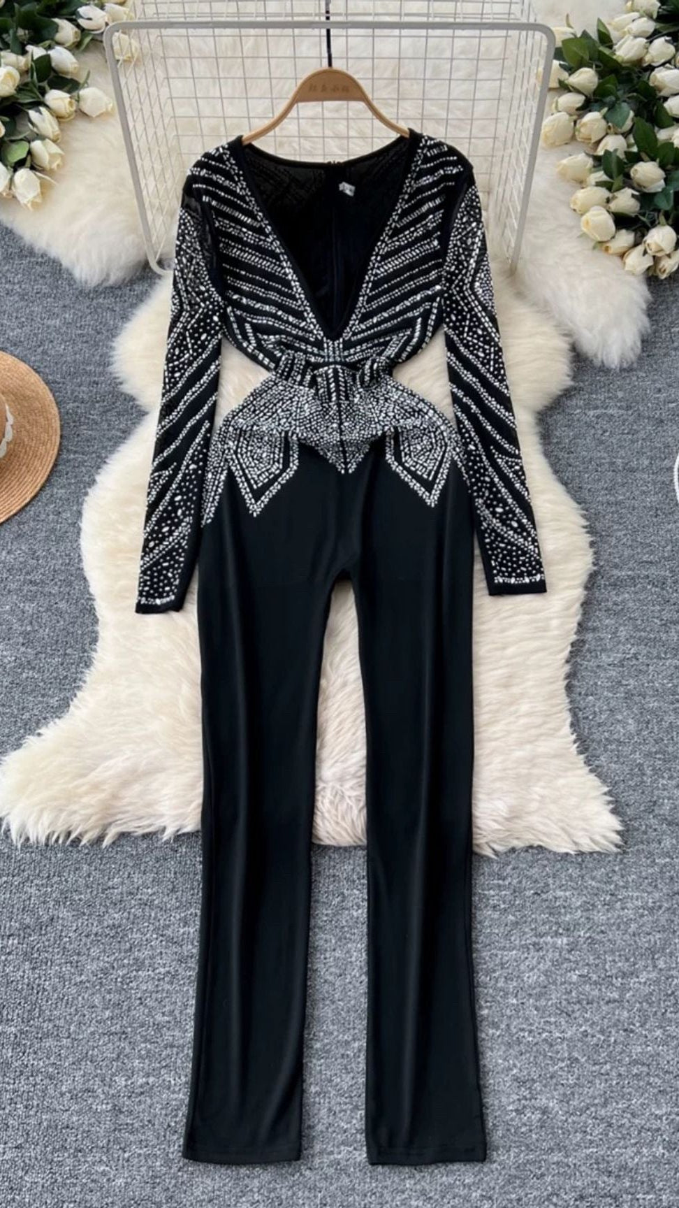 Rhinestone Deep V Neck Jumpsuit FC1451