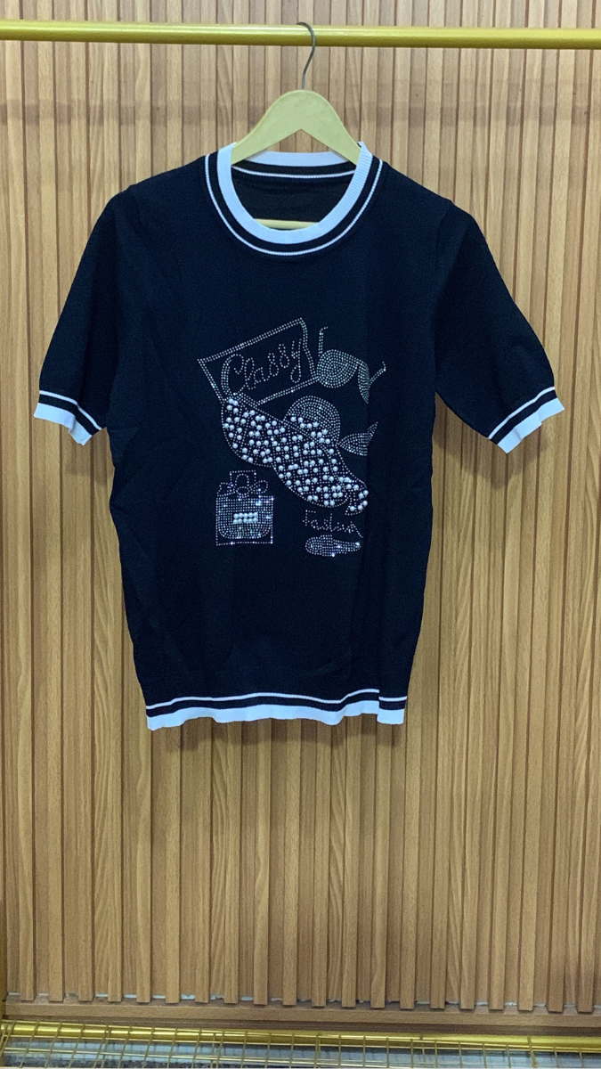 Rhinestone Designed Half Sleeve Round Neck Top FC1911