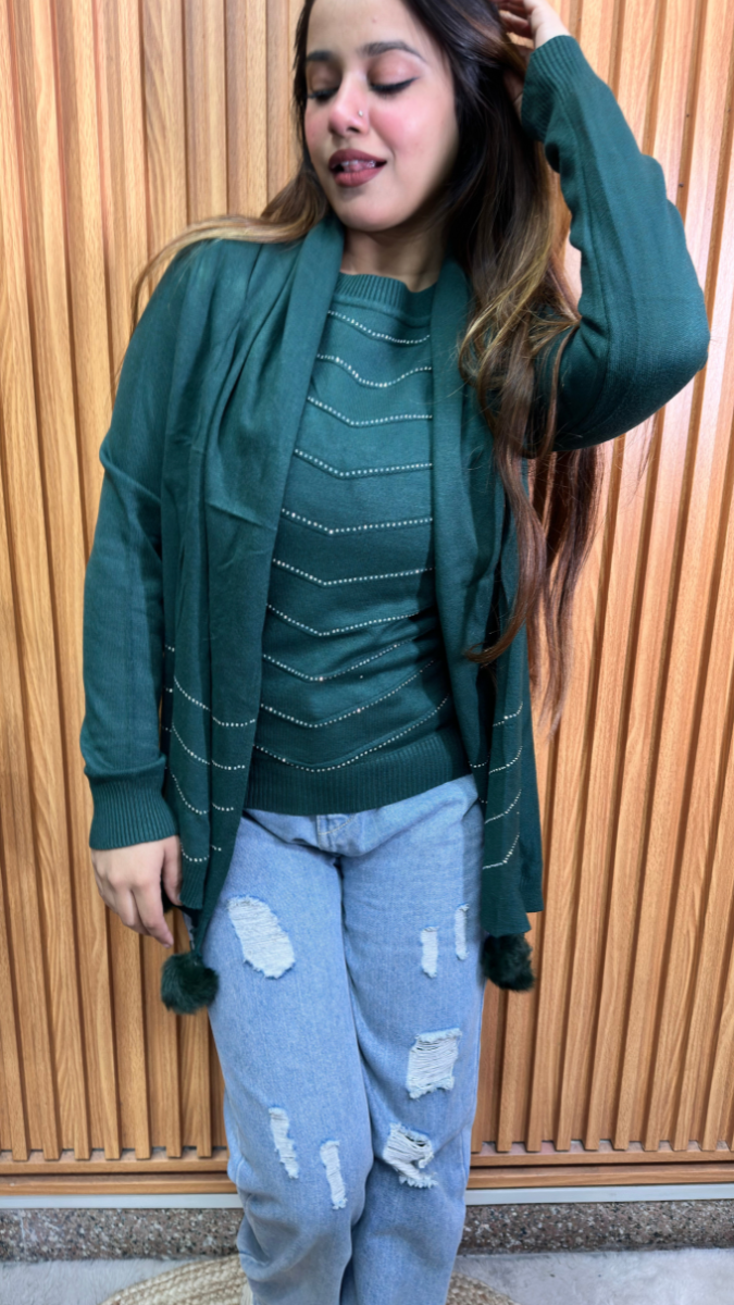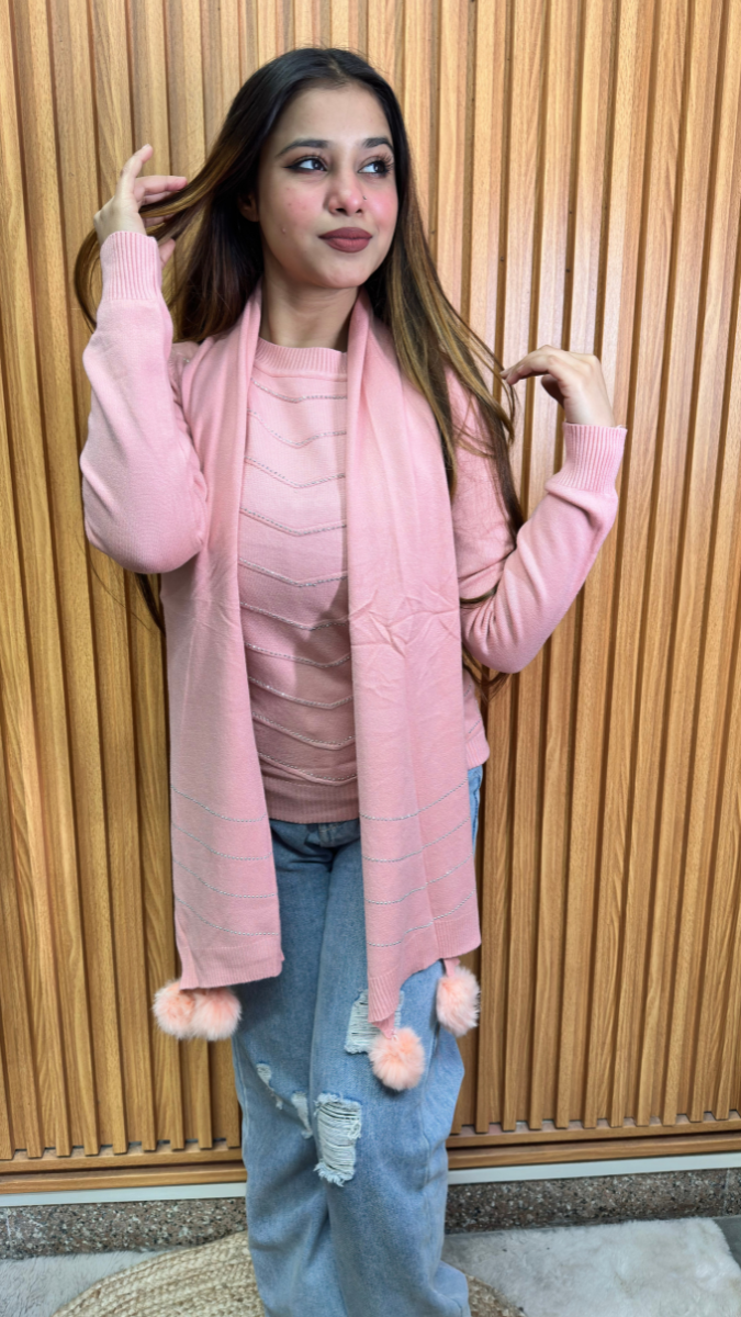 Elevate your wardrobe with the Rhinestone Designed Top With Scarf. This stylish top features carefully placed rhinestones that add a subtle shimmer, enhancing your look with refined elegance. Paired with a coordinating scarf, it offers versatile styling options for both casual and formal occasions. Crafted for comfort and visual appeal, this set effortlessly balances sophistication and practicality.