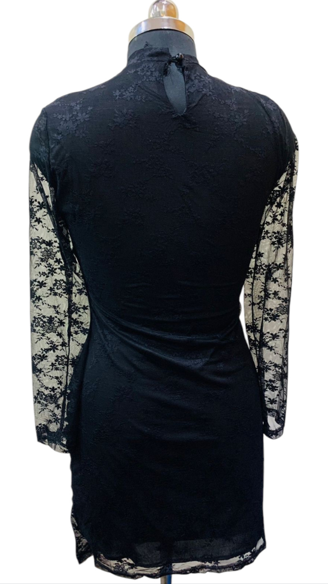 Upgrade your wardrobe with our Rhinestone Flower With Net Sleeve Dress. The intricate rhinestone flower design and elegant net sleeves elevate the dress to a new level of sophistication. Perfect for any special occasion, this dress will make you feel confident and stylish.