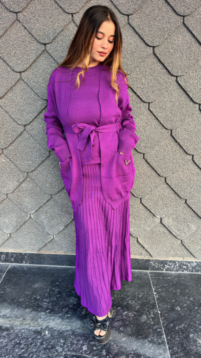 Elevate your wardrobe with this sophisticated three-piece ensemble designed for versatile styling. The set features a classic round neck top paired with an elegantly pleated skirt, complemented by a coordinating shrug that adds dimension and layering options. Perfect for both casual outings and semi-formal occasions, this collection allows you to mix and match pieces to create multiple looks from a single purchase. The thoughtful design ensures comfort without compromising on style, making it an essential addition to any fashion-forward closet.