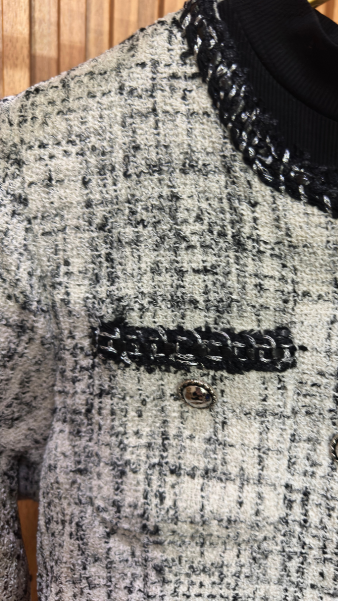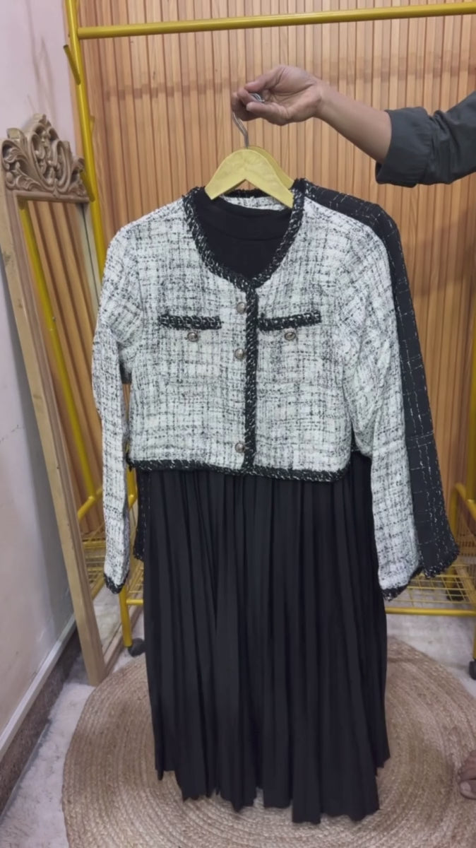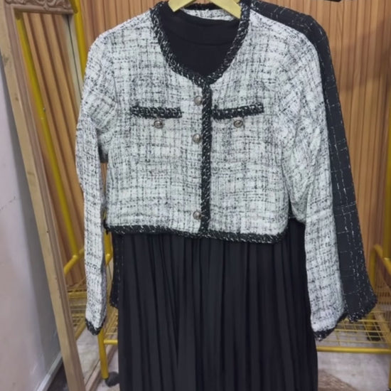 Elevate your wardrobe with this sophisticated two-piece ensemble that seamlessly blends feminine elegance with polished tailoring. The delicate ruffle dress provides graceful movement and visual interest, while the structured tweed blazer adds refined texture and professional polish. Perfect for transitioning from office to evening occasions, this pairing offers versatility without compromise. The complementary silhouettes create a balanced look that flatters various body types, making it an essential investment piece for the discerning dresser who values both style and substance.