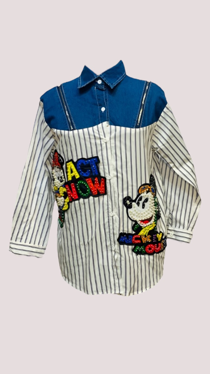 Get ready to bring the fabulous western vibes with you everywhere you go with this stripe shirt. This shirt features a button fastening, stripe, mickey mouse patchwork, two pockets in front, denim inserts, chain for design on shoulders, long sleeves and collar. Perfect for casual, carnival, party, rave costume, outfits, clothes gifts, wedding and cocktail.