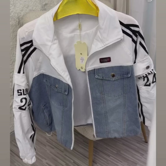 Elevate your denim game with this contemporary half jacket, featuring striking striped sleeves that blend classic workwear with modern edge. The structured denim body provides timeless durability, while contrasting striped sleeves inject personality and visual interest into your everyday rotation. Perfect for layering over tees or shirts, this piece transitions seamlessly from casual weekends to smart-casual occasions. The cropped silhouette offers a flattering fit that works with high-waisted jeans and skirts alike. A versatile wardrobe essential that combines heritage denim craftsmanship with fashion-forward design details.