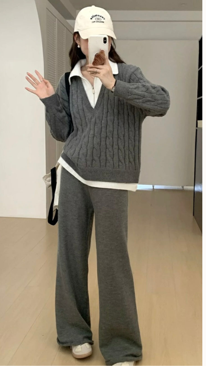 V-Neck Knitted Sweater And Loose Pants Coord Set FC1727