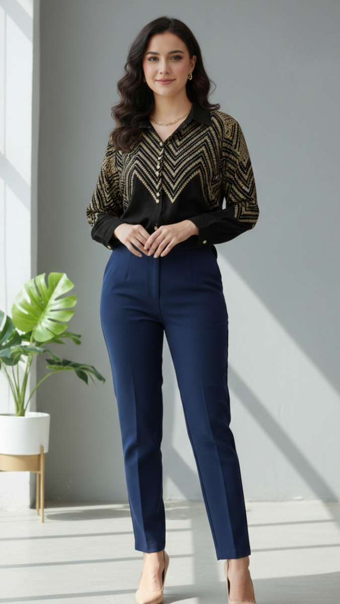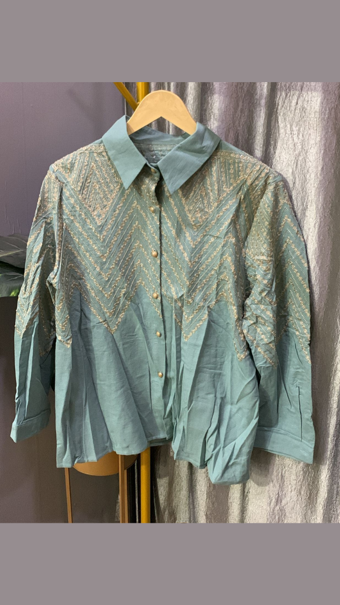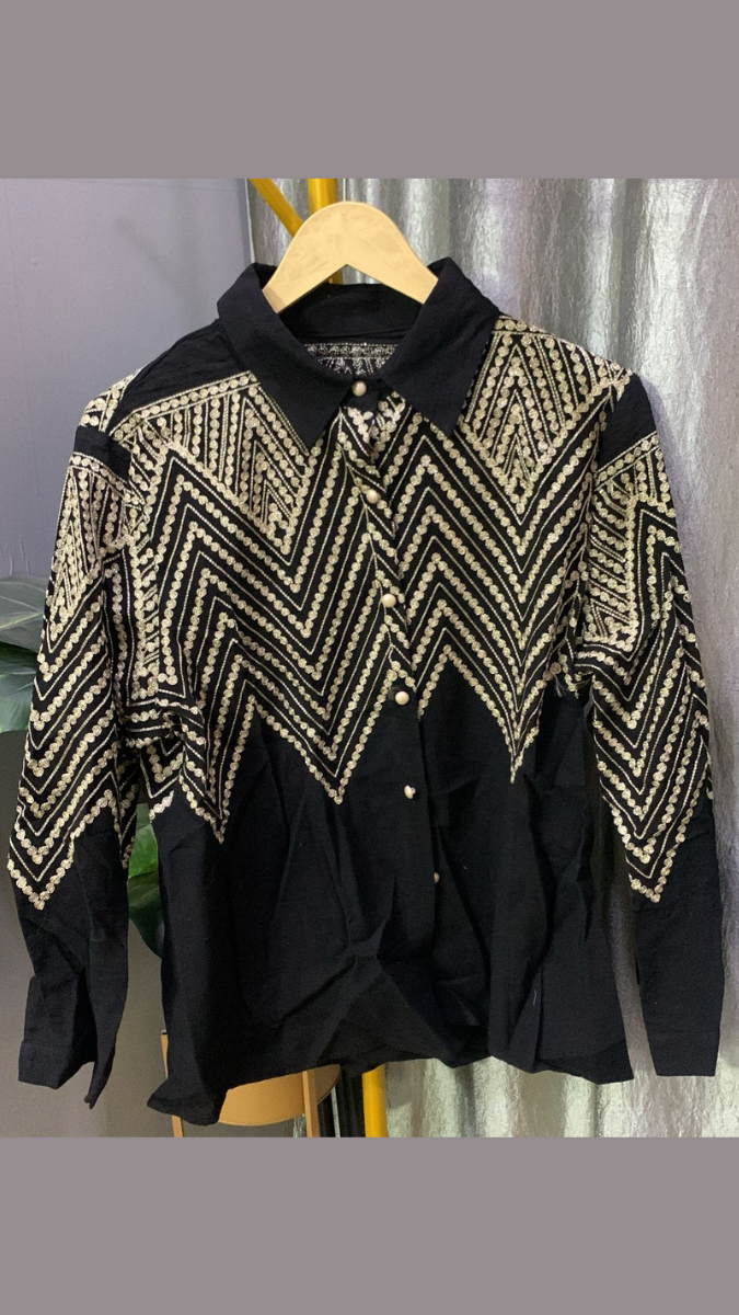Elegant with a modern twist, this wavy embroidery upper shirt is designed to add subtle artistic charm to your wardrobe. Featuring delicate wavy embroidery detailing across the upper portion, it creates texture and visual interest while maintaining a clean, polished silhouette. Comfortable and easy to style, this shirt pairs beautifully with jeans, trousers, or skirts — making it perfect for work, casual outings, or semi-formal occasions.