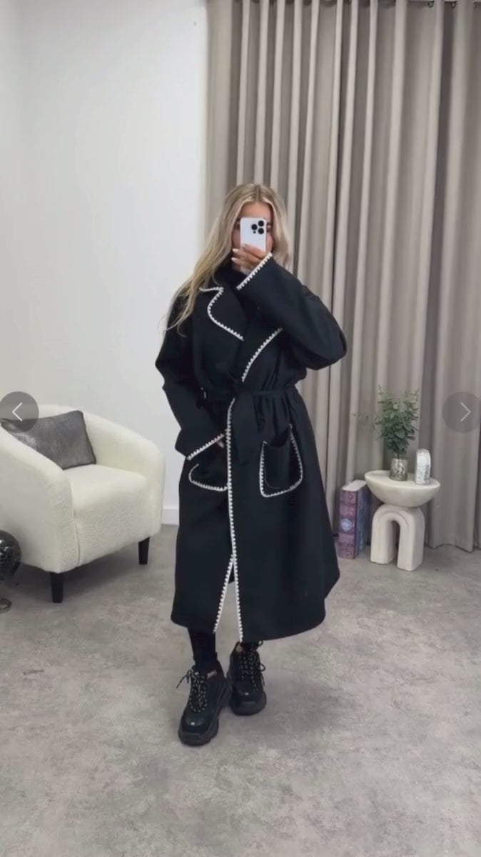Stay warm and stylish with our White Border Long Coat. Made from high-quality materials, this coat features a sleek design and a white border detail that adds a touch of elegance. With its long length, it provides full coverage and maximum protection against the cold weather. Perfect for any occasion, this coat is a must-have in your winter wardrobe.