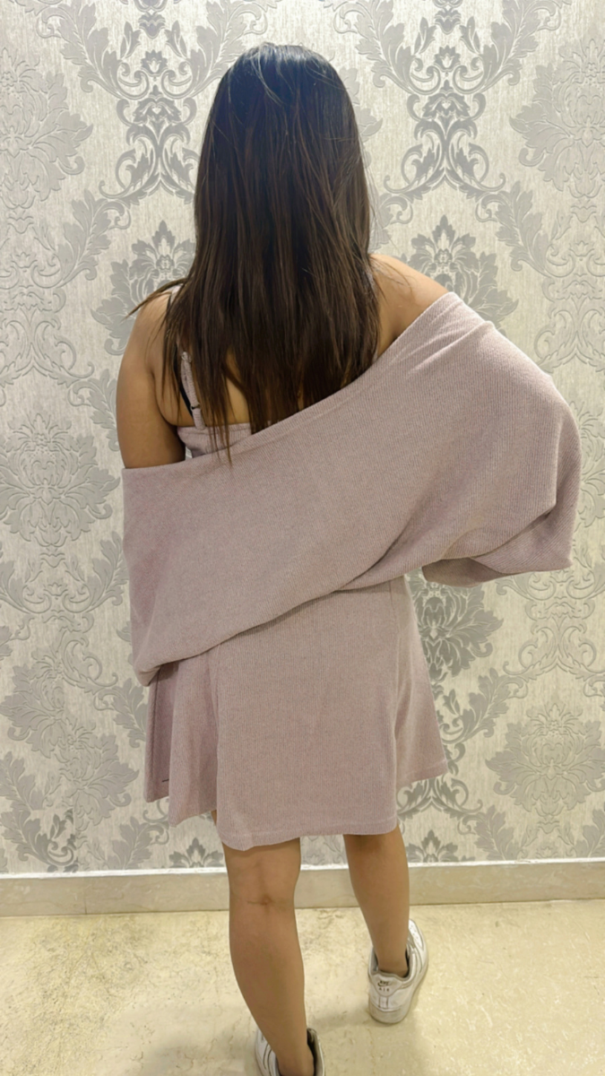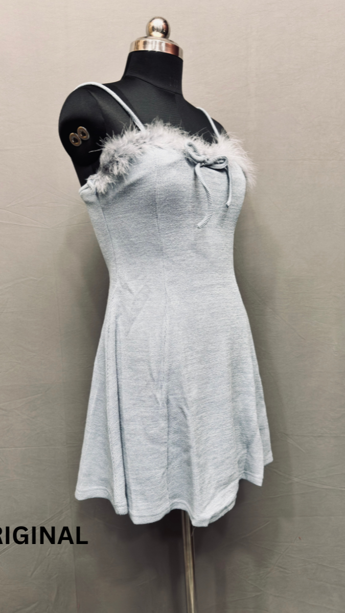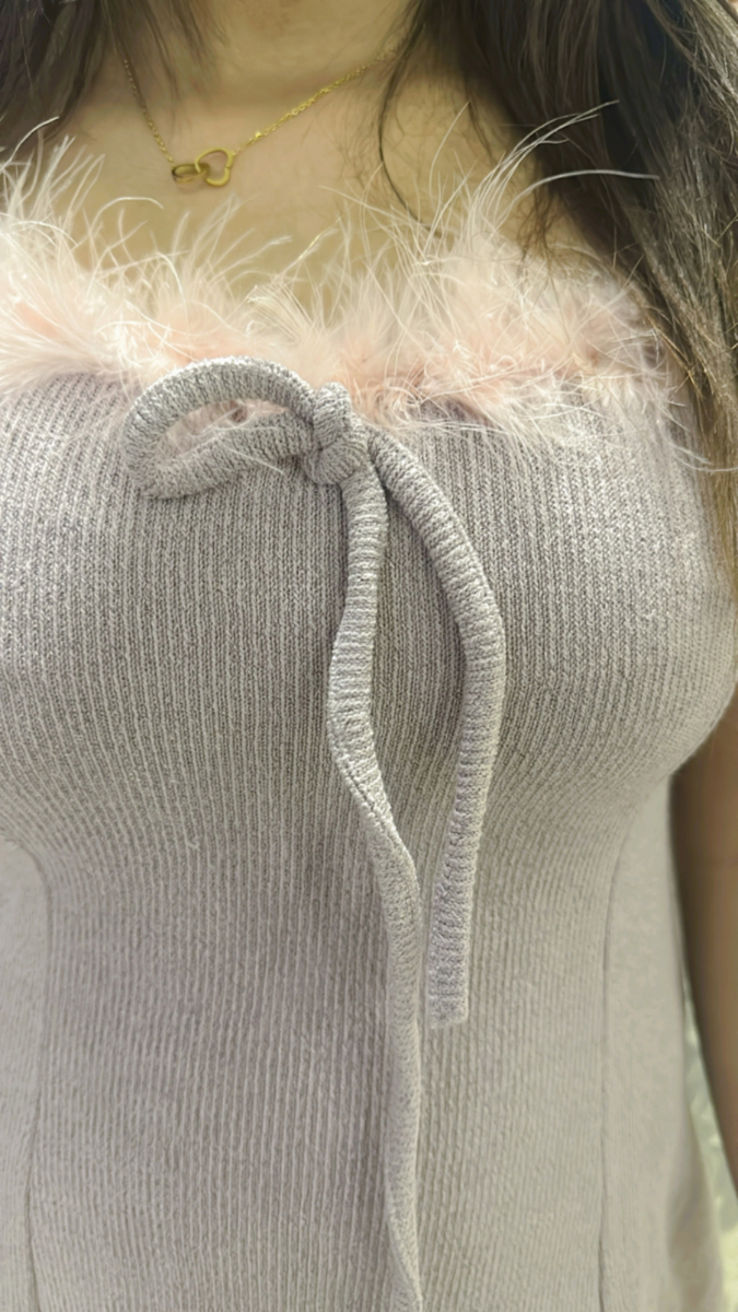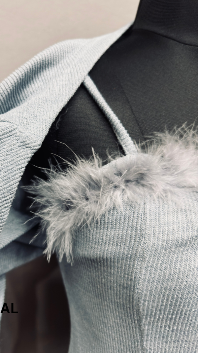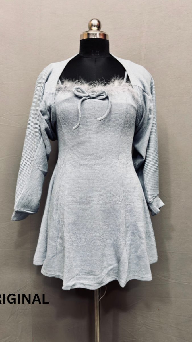 This Women Knitted Two Piece Suspender Skirt Winter Dress has detachable shrug. Dress has strap sleeves, knitted fabric, fur on neckline, chain on side, small bow on neck and knee length. Shrug has long sleeves and stylish design. Perfect for various occasions like party, dating, club wear, night out, daily life and outgoing.